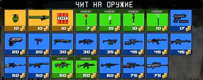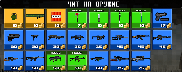 Согаситесь, играть в Блоаду онлайн, не имея при этом эффективного оружия, как-то не серьезно. Естественно, можно копить монеты и пытаться купить новое оружие, но как по мне, куда проще прибегнуть к помощи отличных читов и получить его бесплатно. В игре Блокада 3D очень большой выбор оружия, который с каждым обновлением пополняется. На данный момент там можно найти: пистолет, дробовик, метательное оружие, гранаты, TNT, автомат, пулемет и снайперскую винтовку. Всё это оружие хочется опробовать в бою и найти лучше для себя для того чтобы ускорить весь этот процесс существует чит на оружие. Если вам нужно снарядить вашего персонажа по полной, то тут пригодиться чит на монеты. | |